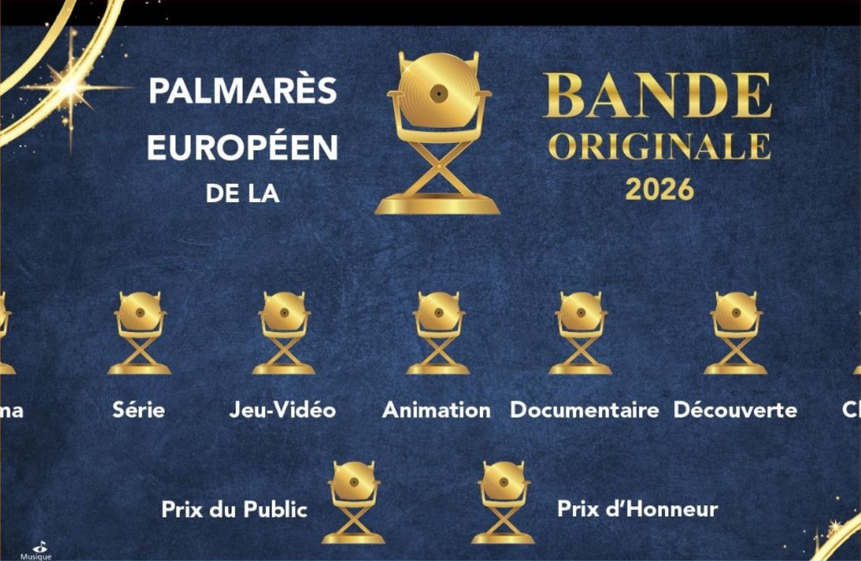 Le trophée remis aux lauréats, une création originale de Viktorija Antonovic, symbolise le cinéma par une chaise de tournage et la musique par un disque. Sa production a été rendue possible grâce à la collaboration de Virginie Lozay pour la modélisation 3D et de Stéphane Robinot pour l’impression 3D. Chaque artiste récompensé a par ailleurs eu le privilège d’entendre un court extrait de son œuvre durant la cérémonie.