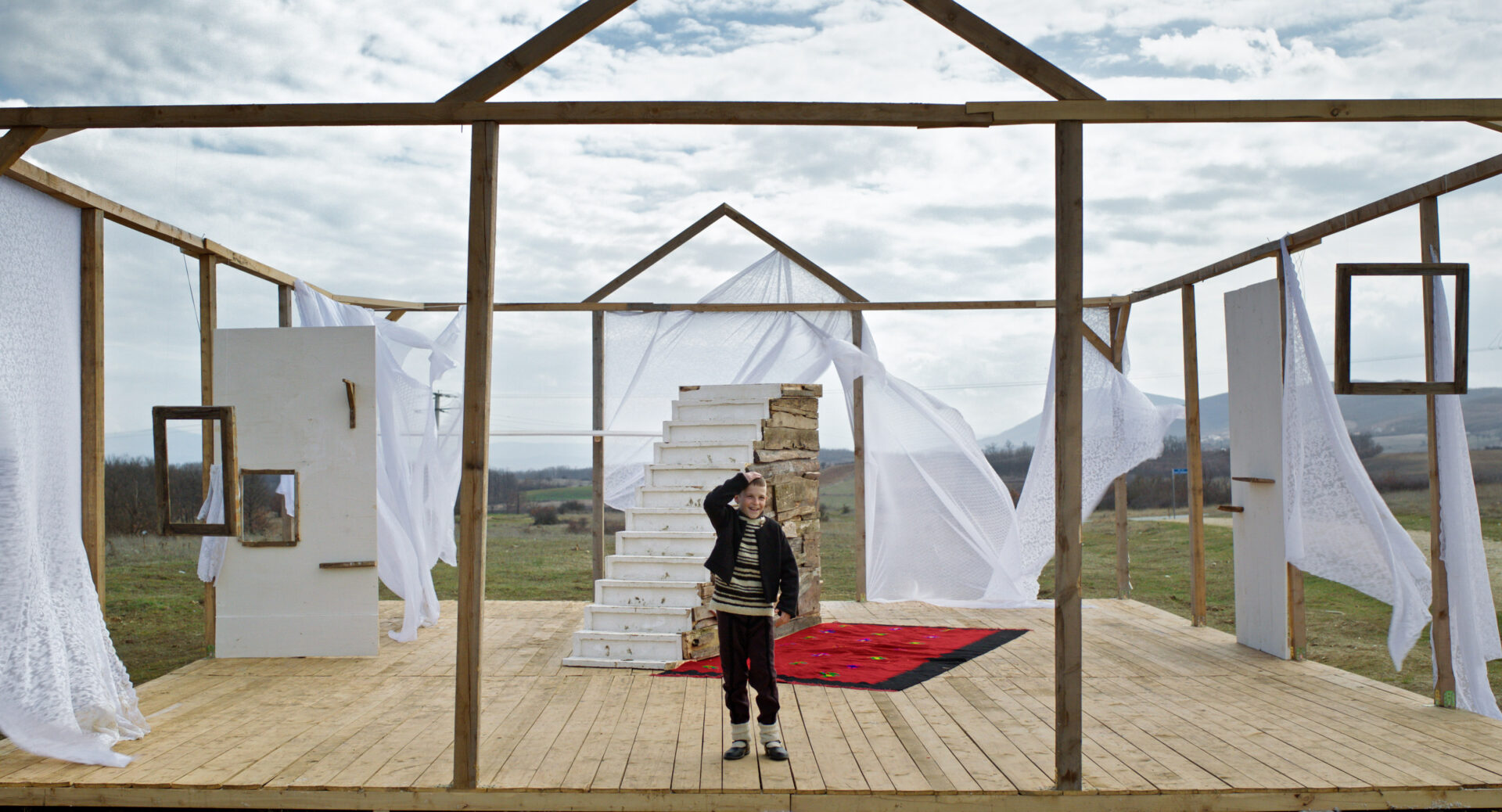 La réponse de Gjinovci est d’une audace et d’une délicatesse remarquables. Plutôt que de filmer l’absence, elle décide de construire – dans tous les sens du terme. Avec les habitant·es du village, elle érige une reconstitution à la fois architecturale et mémorielle : une structure de bois, faite de vieilles planches patinées et de neuves que l’on a vieillies, avec un simple escalier, des fenêtres esquissées, des portes qui ne ferment sur rien, un tapis rouge et des tissus qui flottent au vent, comme une peau fragile, figurant les contours de la maison d’Asllan. Un espace qui est à la fois maison et théâtre, refuge et scène. Le village joue son propre village d’autrefois. Les habitant·es endossent les rôles des habitant·es qu’ils et elles auraient pu être. Un enfant du cru joue le jeune Asllan. Et quelque chose d’inattendu se produit : la fiction ne trahit pas la réalité, elle l’amplifie.