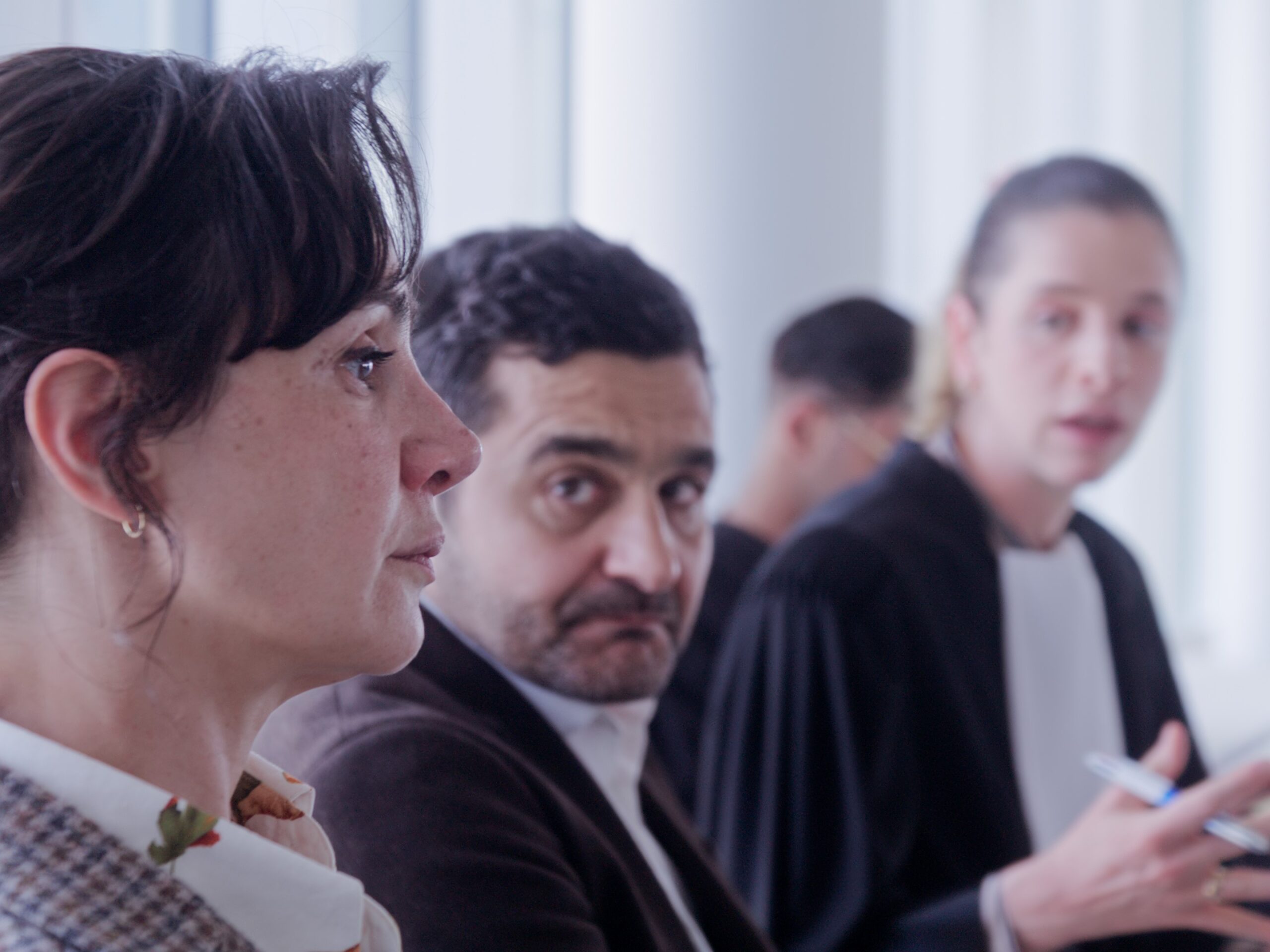 Oui, tous les trois. Cela a permis un travail approfondi sur la dramaturgie, en veillant à inclure des rebondissements. C’était la première base. Ensuite, pour cette scène d’audience en particulier, tout était très précisément écrit. Nous avons demandé à Myriem et Laurent d’apprendre leur texte au mot près. En revanche, les avocat·es ont appris la trame générale, mais nous leur avons demandé de préparer leurs plaidoiries comme pour une vraie affaire.