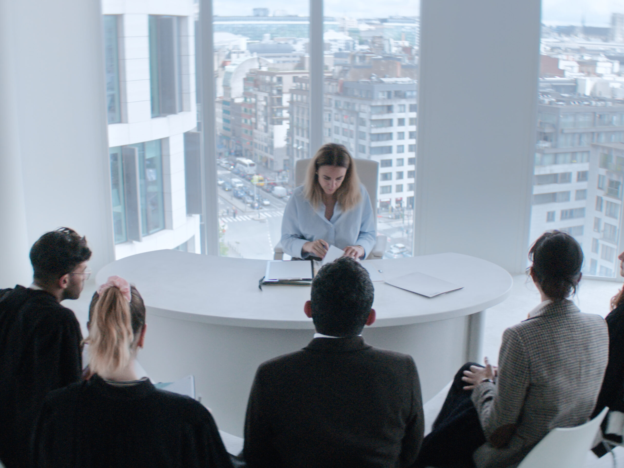 Lorsque nous avons trouvé le plateau de jeu — un espace de coworking avec de la moquette, qui apportait une certaine douceur —, les espaces se sont presque dessinés d’eux-mêmes. Nous n’avons utilisé aucune lumière additionnelle. La lumière naturelle a tracé les contours des différents espaces au sol, ce qui était fascinant. La salle d’attente des parents et des autres protagonistes s’est littéralement dessinée au sol ainsi. Nous avons alors validé cet agencement, avec cette forme arrondie pour la salle d’audience. Tous ces espaces ont été créés très simplement, en retournant trois bancs et un bureau — une installation très légère, mais qui s’est avérée amplement suffisante.